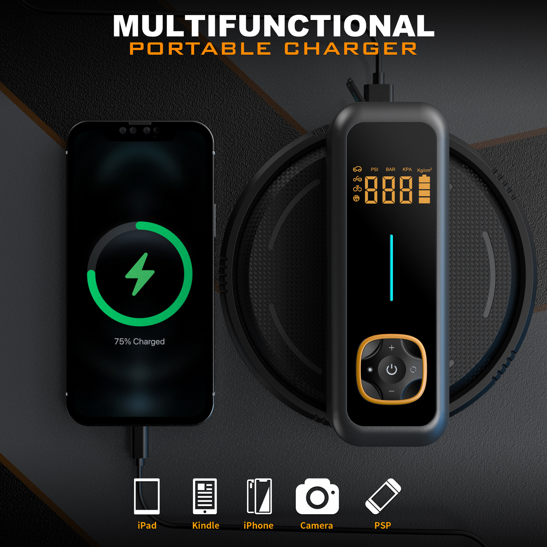 Built-in large-capacity rechargeable lithium battery (optional 2000mAh/4000mAh versions). When fully charged, it can inflate 4 car tires (from 2.0Bar to 2.5Bar). No need to connect to the car cigarette lighter or external power supply, making it usable for emergency inflation during outdoor camping or in remote road sections. It also supports USB reverse charging and can be used as an emergency power bank for mobile phones.